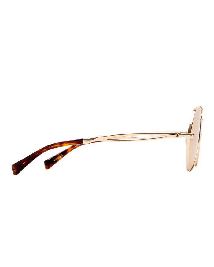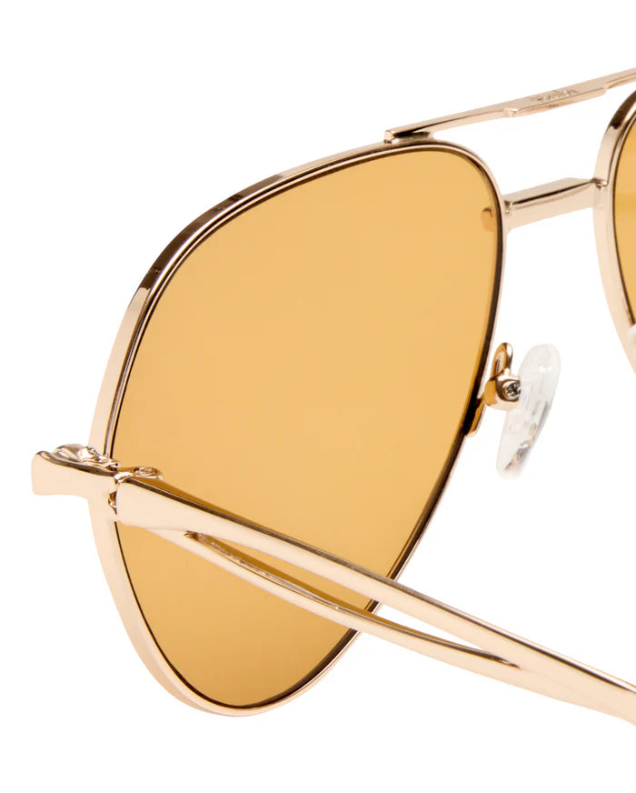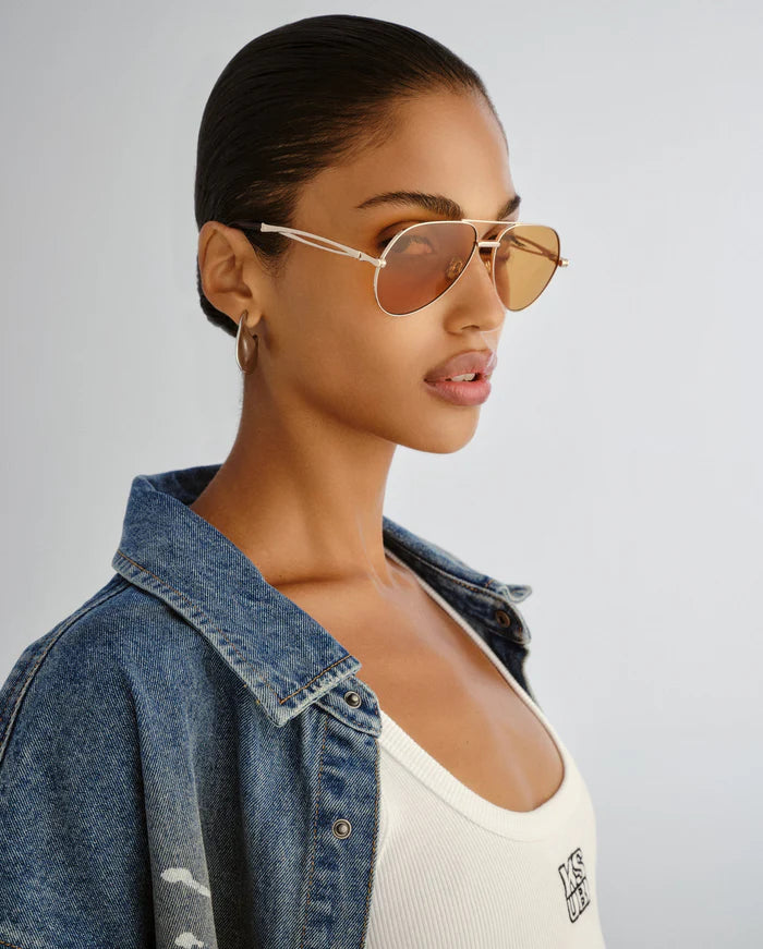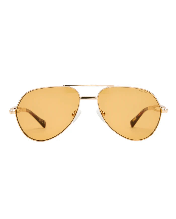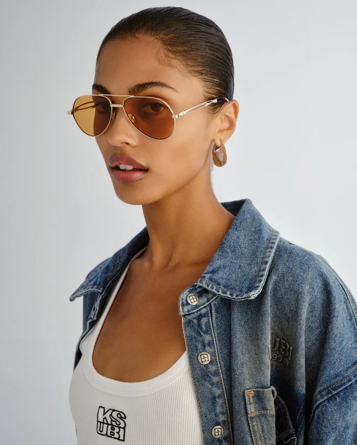 The Montana Sunglasses Gold Amber are an elevated take on the classic aviator, featuring an oversized metal frame that makes a statement through scale and structure. Lightweight yet impactful, they include Ksubi's signature skeletal temple hardware for a raw, industrial edge, and are delivered in signature Ksubi eyewear packaging with a branded cleaning cloth.