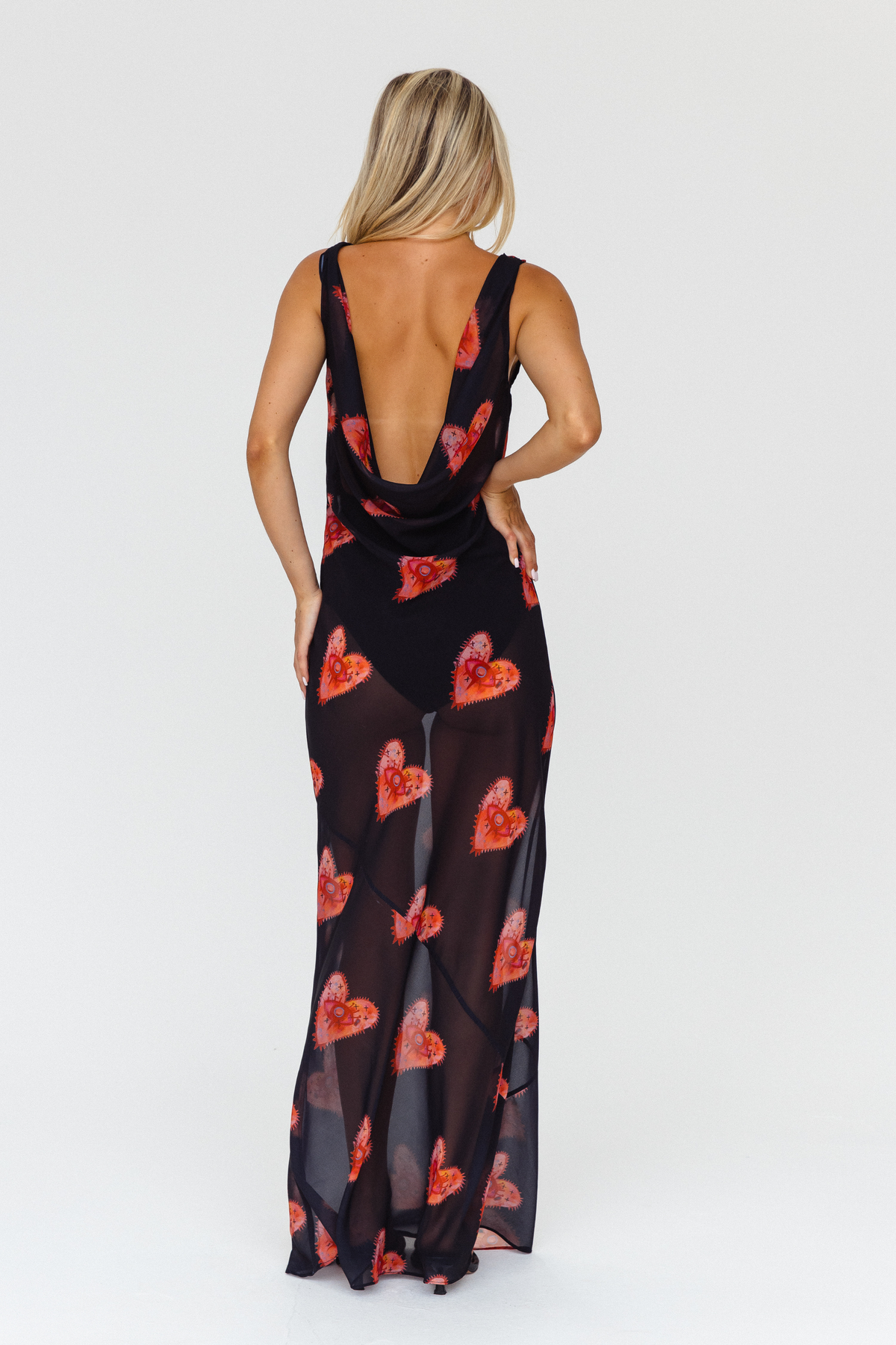 Fall head over heels for the Solana Maxi Dress, where romance meets modern style. This whimsical design showcases an adorable heart print on luxuriously sheer fabric that catches the light beautifully. The high neckline keeps things classy while the daring cowl scooped back reveals just enough to turn heads. Expertly cut on the bias for a silhouette that hugs and flows in all the right places, this dress is your ticket to feeling fabulous and utterly charming.