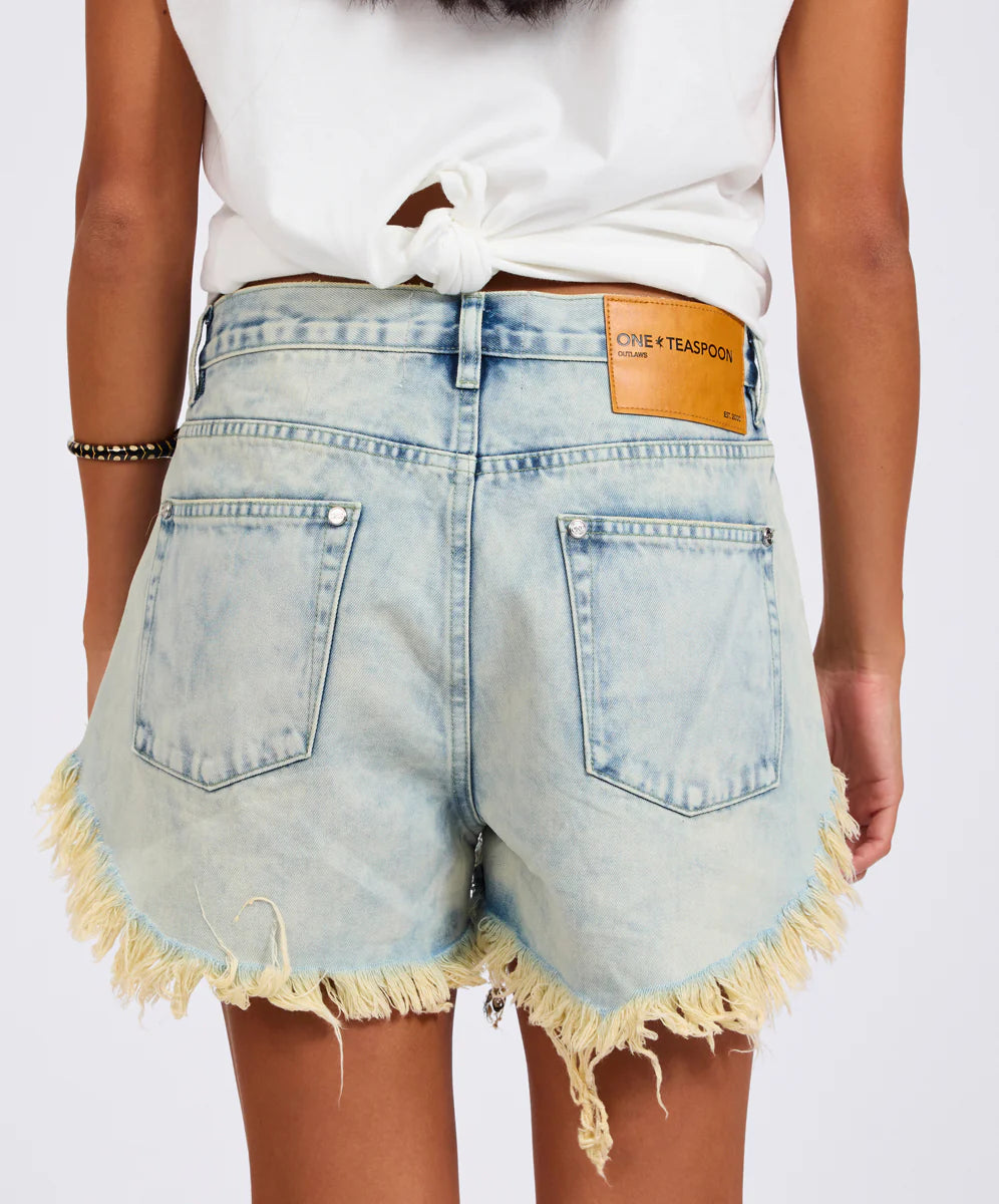 The BLUE OUTLAWS LOW WAIST MID LENGTH DENIM SHORTS are an ode to laid-back rebellion. Designed for everyday ease with a flattering curved hem and raw fray finish.Pair with graphic tees or balance with structured shirts for a relaxed yet elevated feel.