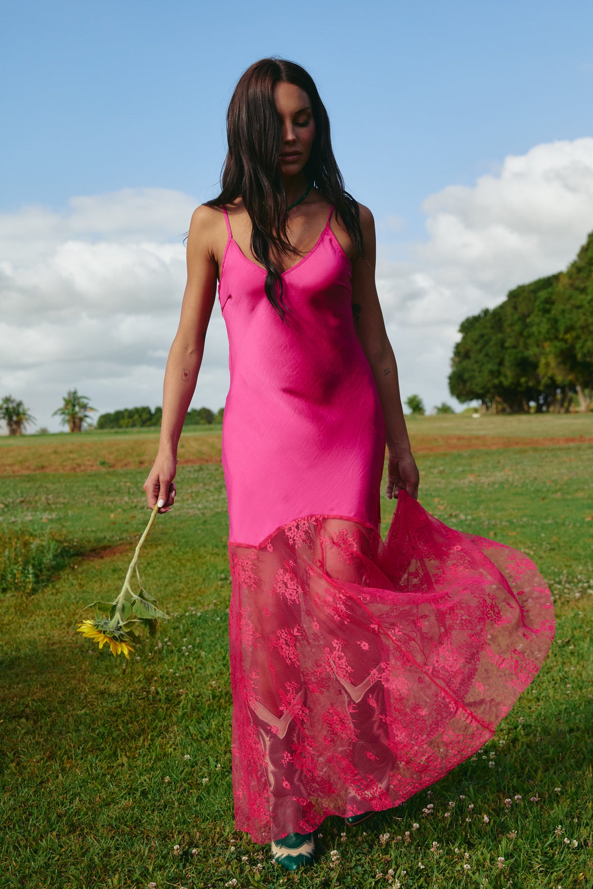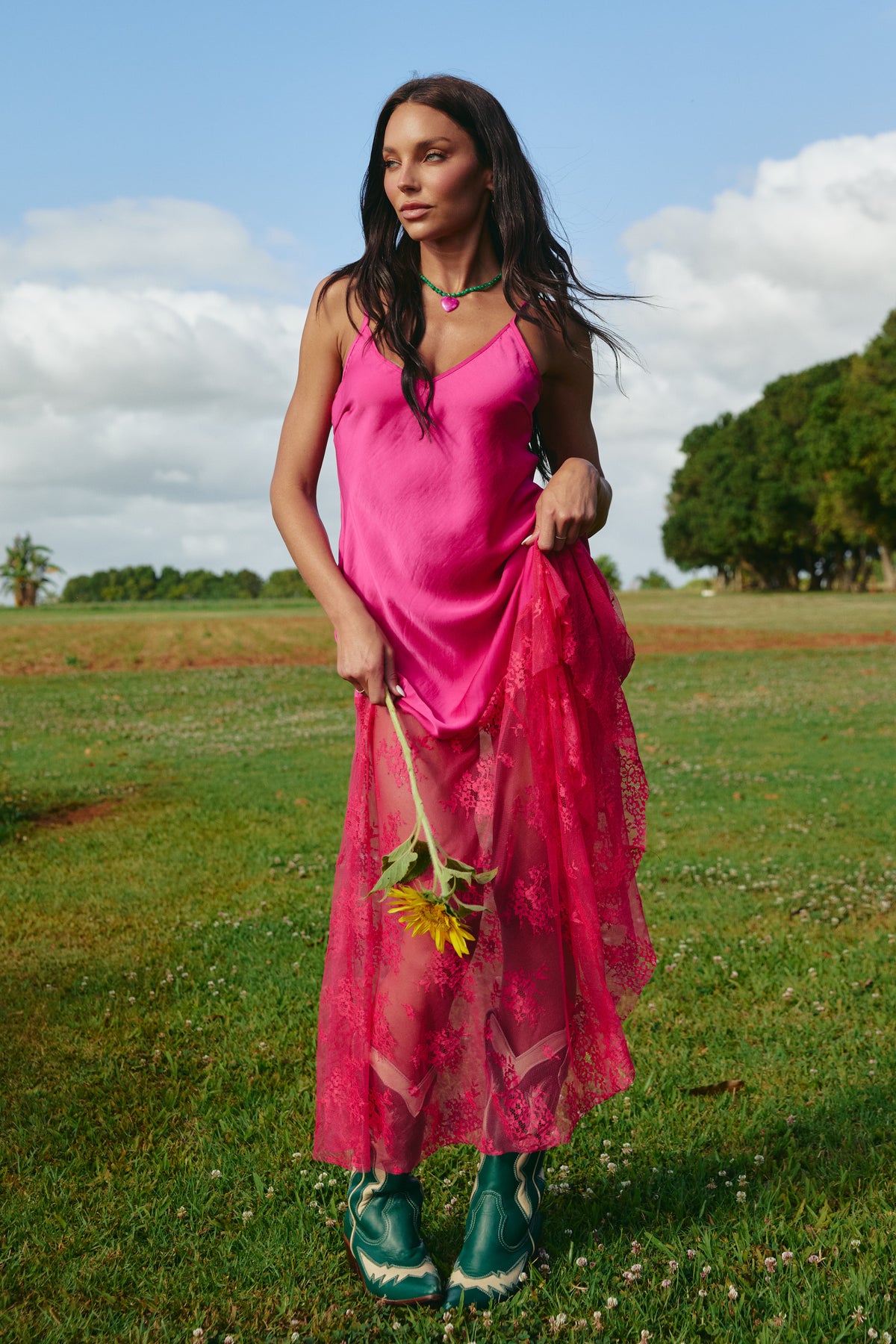 The Lace Maxi Dress is the summer showstopper you didn’t know you needed. A silky satin slip with sheer lace, it’s a perfect clash of soft and bold — effortlessly sexy, endlessly wearable.