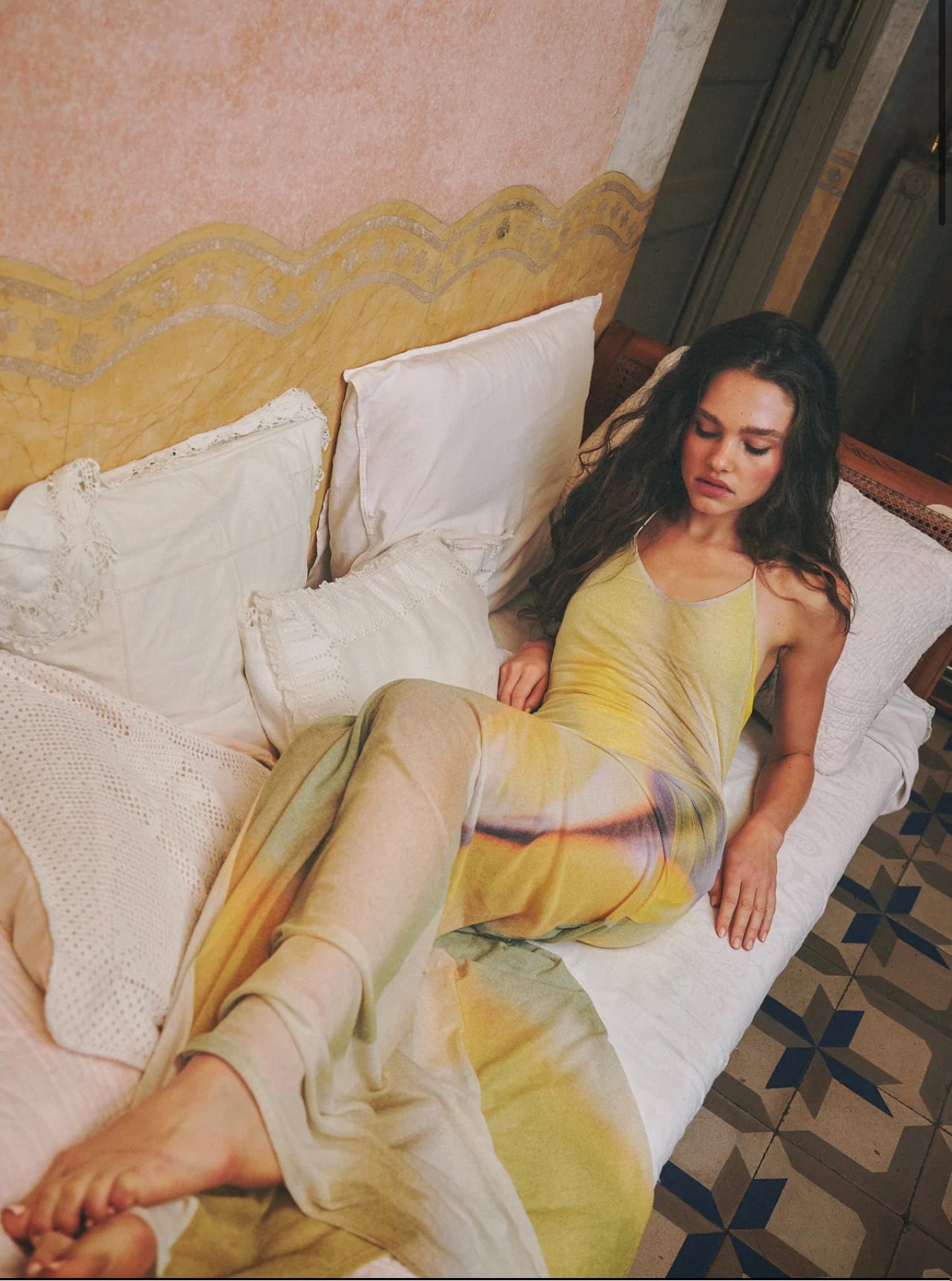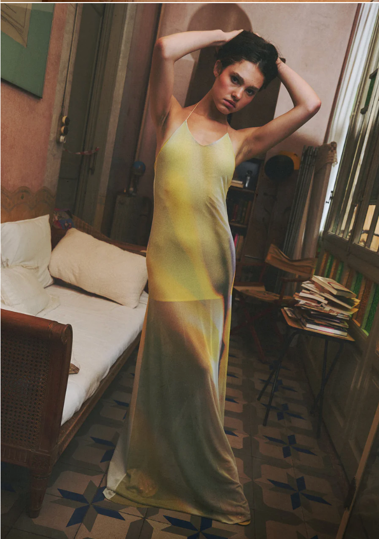 The Balita Dress is crafted in lightweight mesh with a halter neckline and an open back that ties delicately at the neck. It features a built-in lining for comfort and coverage, while the long, flowy silhouette skims the body and moves with ease. A luminous print brings depth and dimension to this effortless piece — made to float through summer days and golden evenin