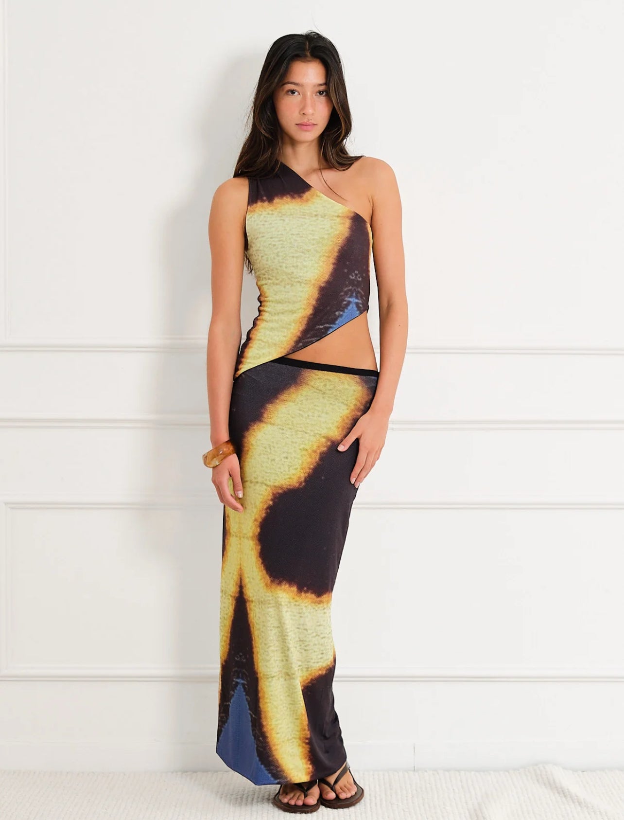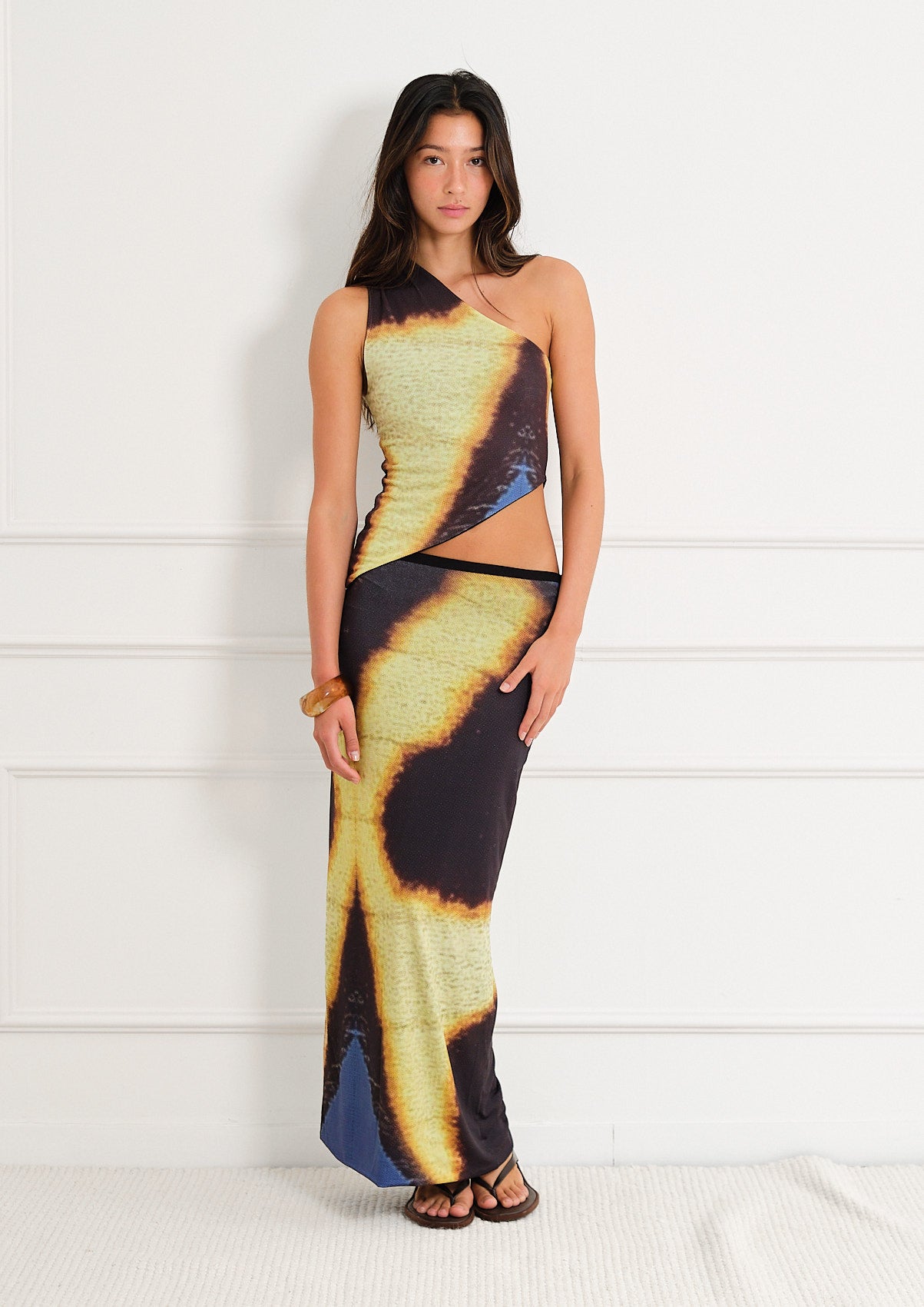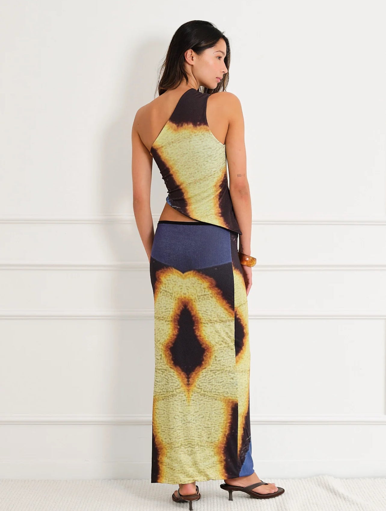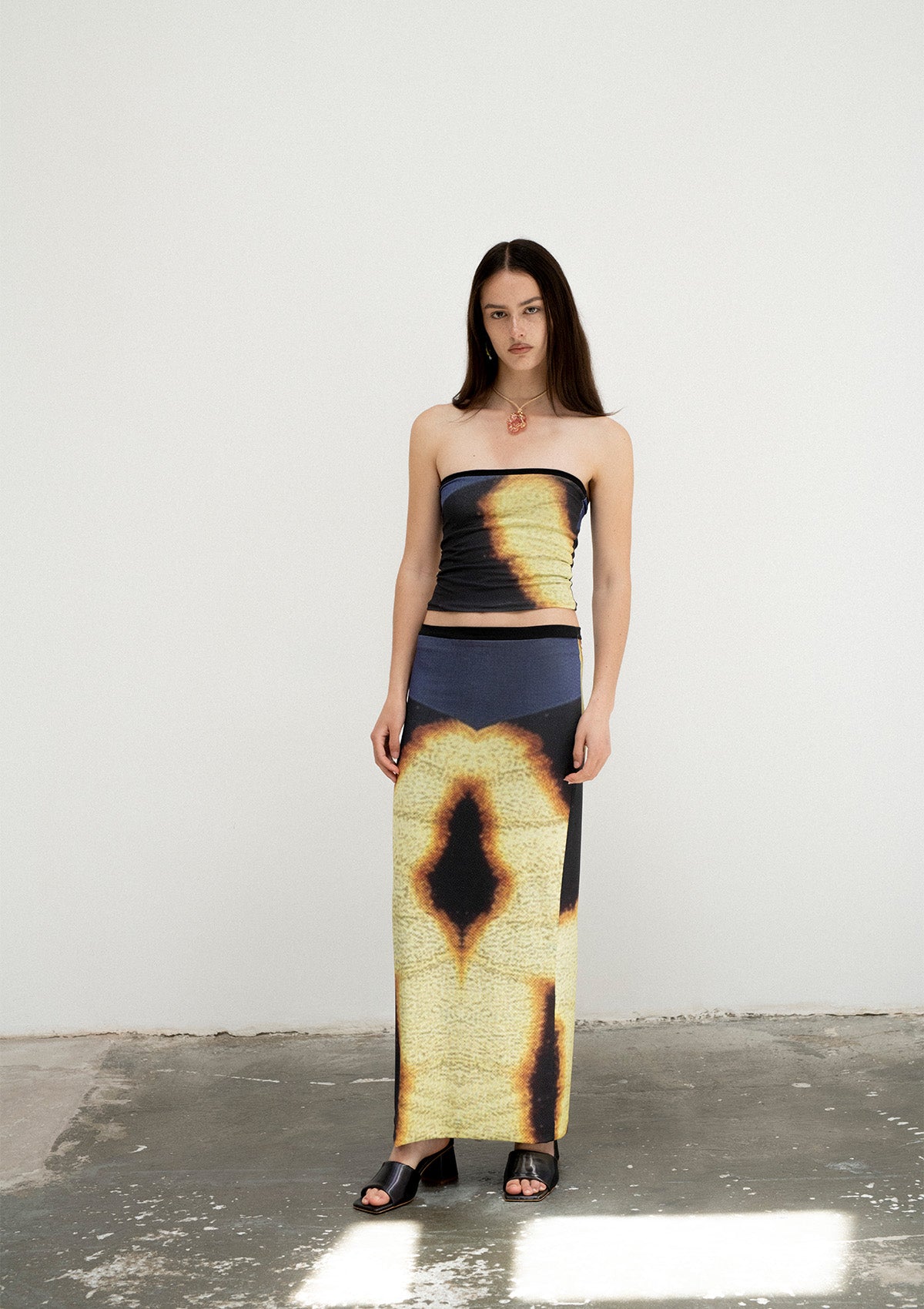 The Tu x Mi Skirt by Spanish brand Feners.  Designed to complement the "Yo x ti" top, this reversible skirt boasts a custom print that seamlessly coordinates with your outfit. With its versatile style and unique design, this skirt offers multiple fashion options, allowing you to express your individuality with ease.