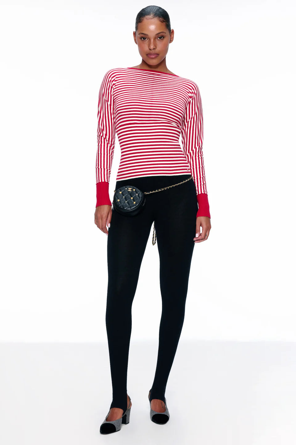 The Odessa Top is back in a festive red and white stripe - this instant classic has extra long, breezy balloon sleeves and a fitted bodice for a playful, chic look. Styled with our knit Layla Legging.