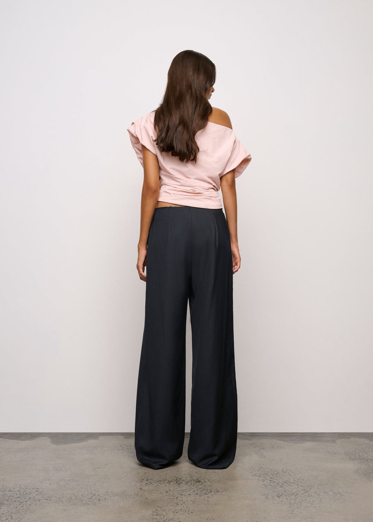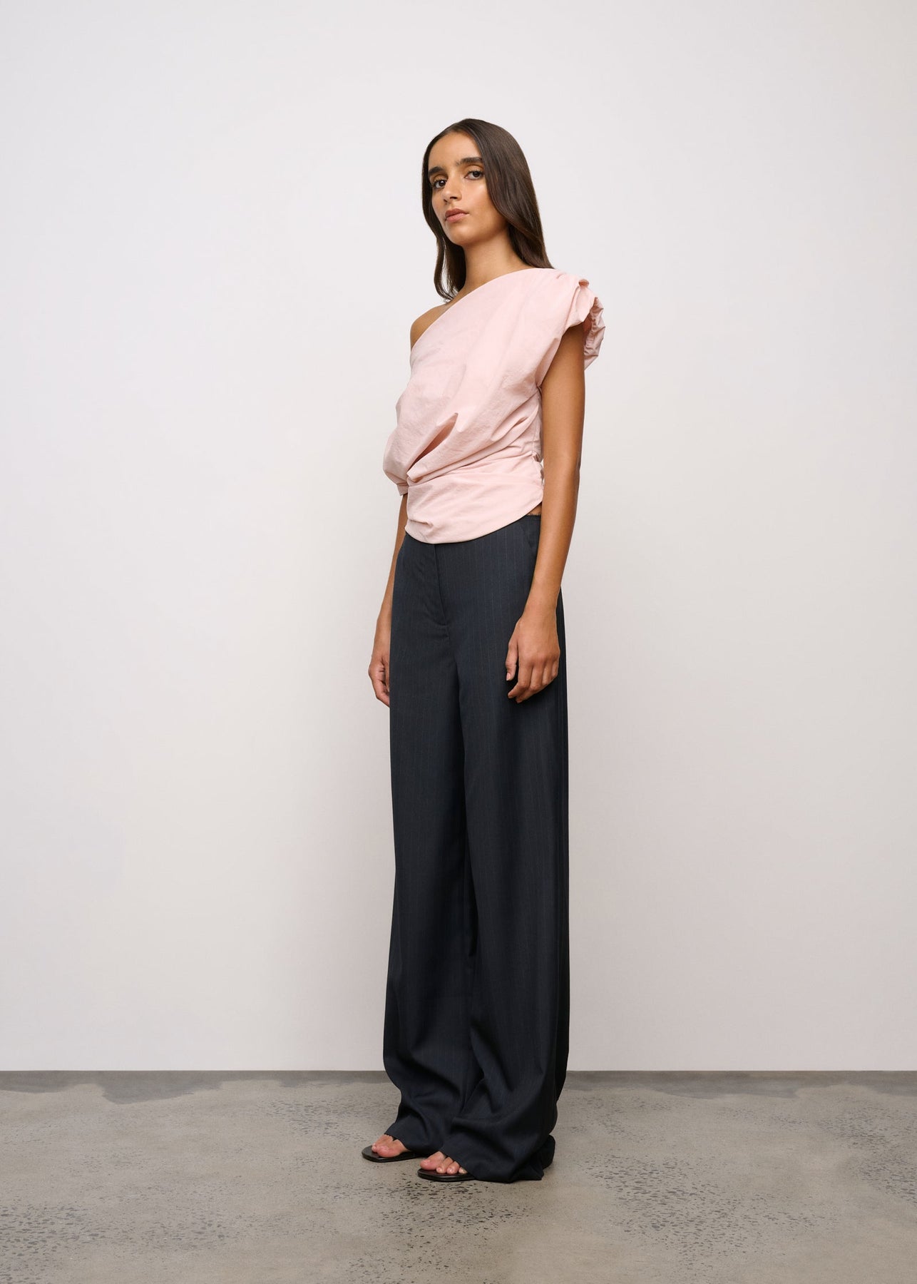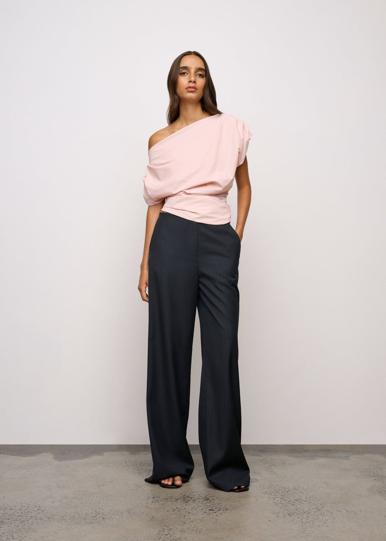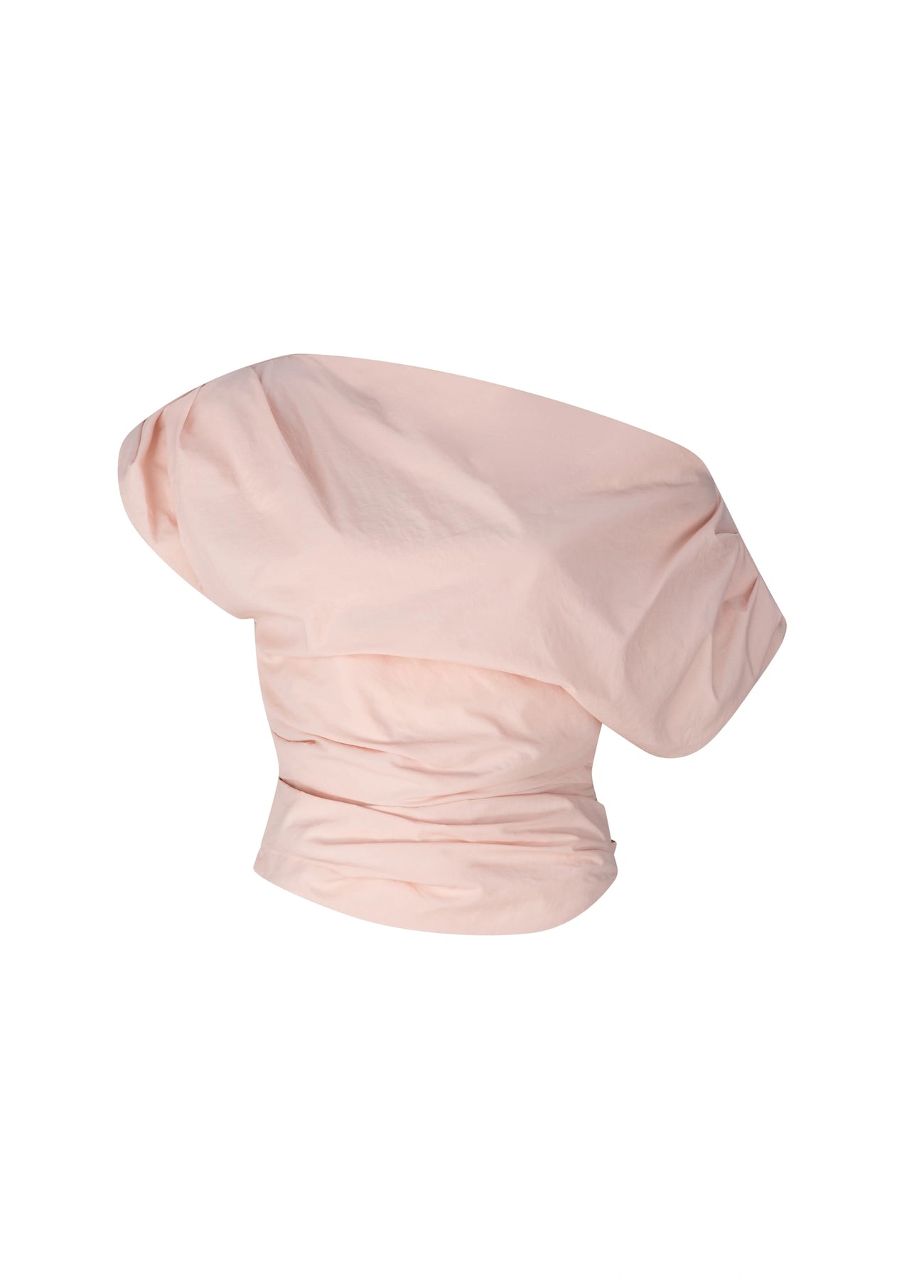 The Henri Top in MUSK BY ONE OF OTHERS. An off-shoulder silhouette with asymmetric draping and a cinched waist. Cut in lightweight nylon for structure with movement. Effortless, modern, and precise.
