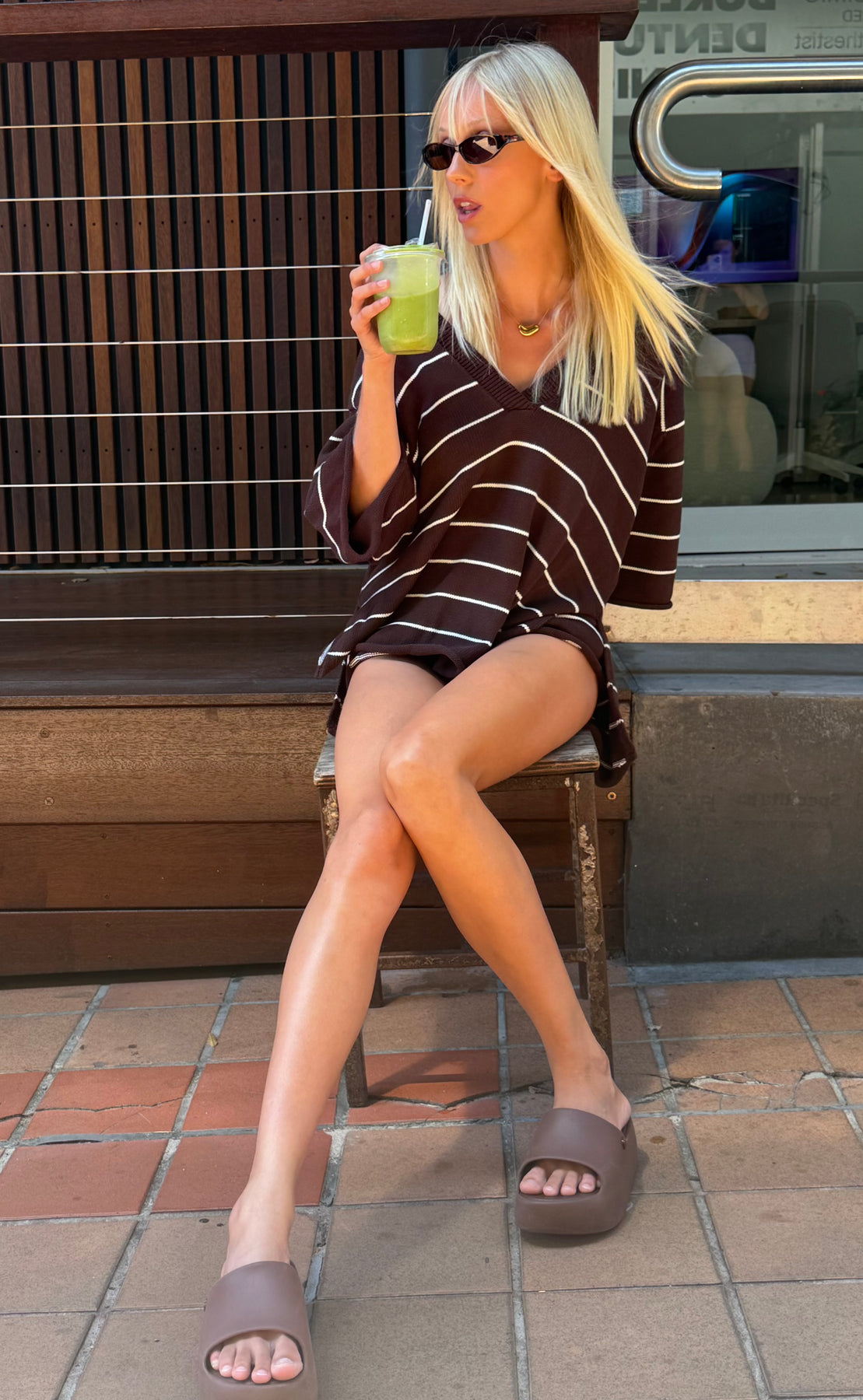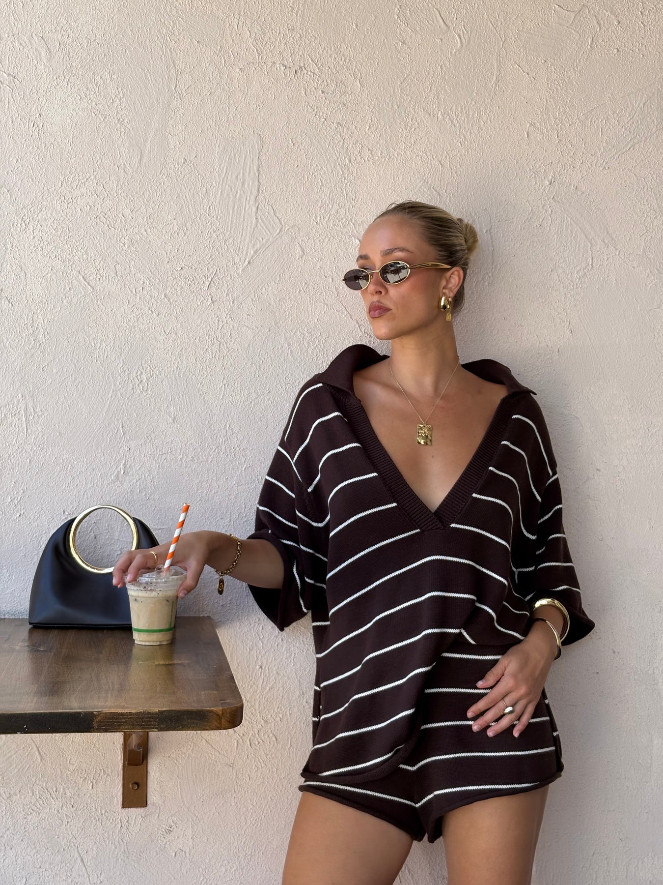Say hello to Brando by The Line. An oversized cotton knit polo in chocolate with fine cream stripe.  Designed with a relaxed fit and soft drop shoulder, the Marlon sits loose through the body with a deep V neckline and subtle collar detail. Soft against the skin with an effortless drape.