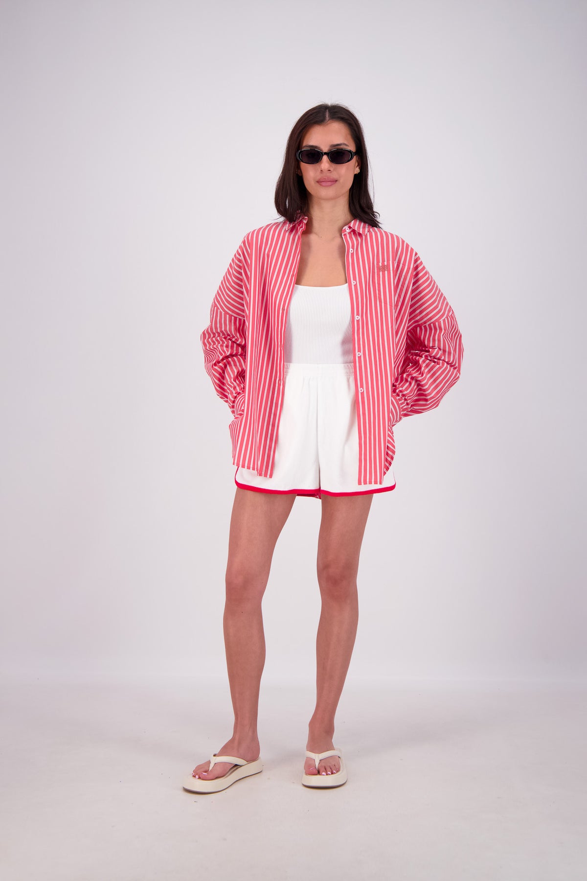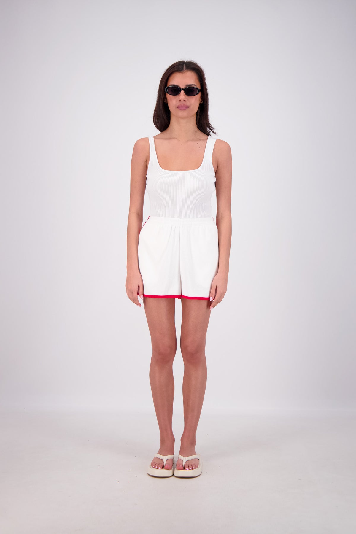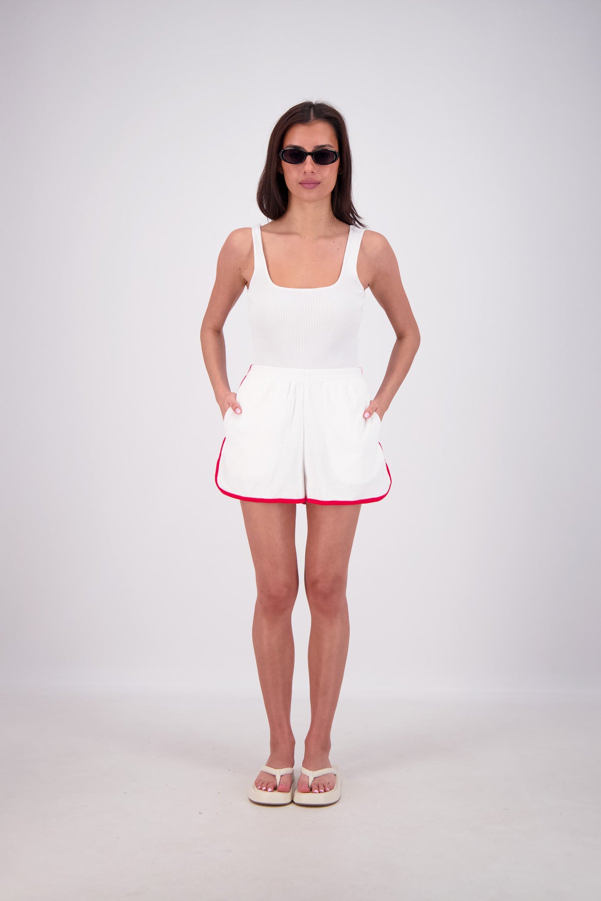 Experience all-day comfort with the Kuhio Shorts in White, crafted from soft cotton terry for a breathable, relaxed fit. Practical and stylish, they feature two side pockets and a striking contrast stripe detail. The elastic waistband offers a perfect fit, while the curved hem with side splits adds effortless movement. Designed to withstand frequent washing without losing shape, these shorts are your go-to choice this summer for easy, stylish wear every day.