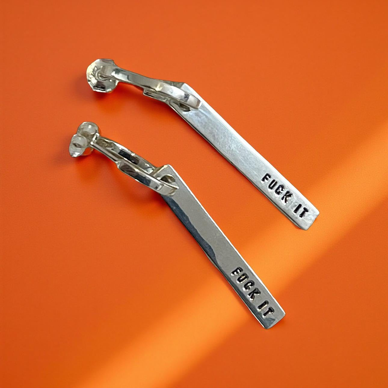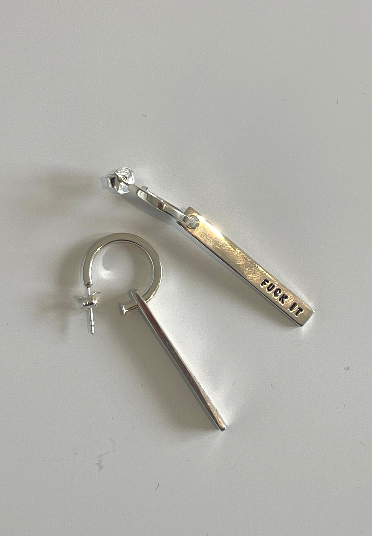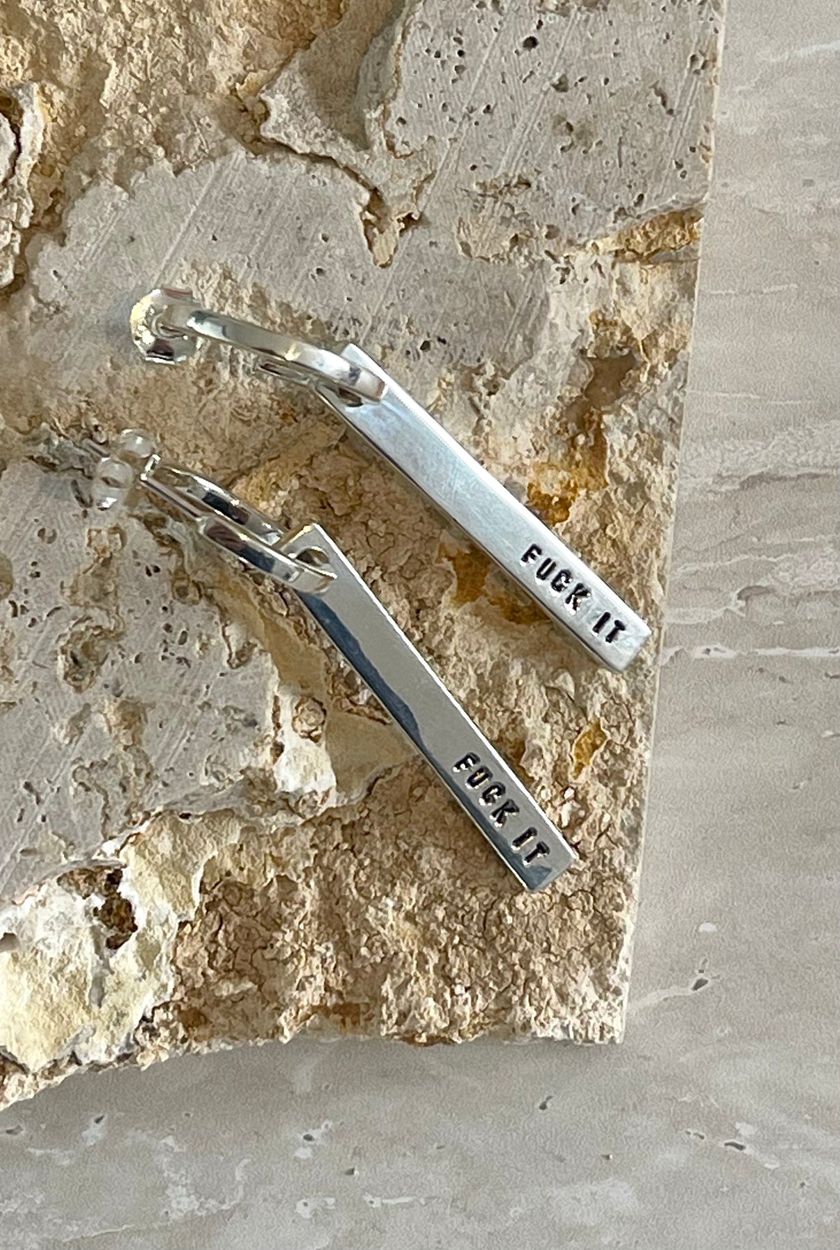 50mm of pure attitude. Hand-stamped in sterling silver with “FUCK IT” — hoops that don’t ask, they tell.