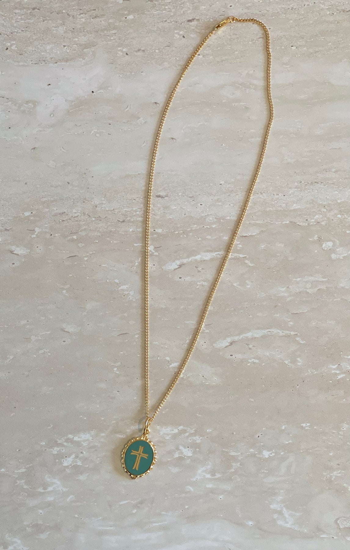 The Cross Coin by Nikki Ross — turquoise enamel wrapped in 18 CT gold-plated sterling silver. Set with a sleek cross, this pendant brings a gorgeous pop of colour to any neck stack. Strung on a 45cm curb link chain, it’s the perfect mix of bold and symbolic.