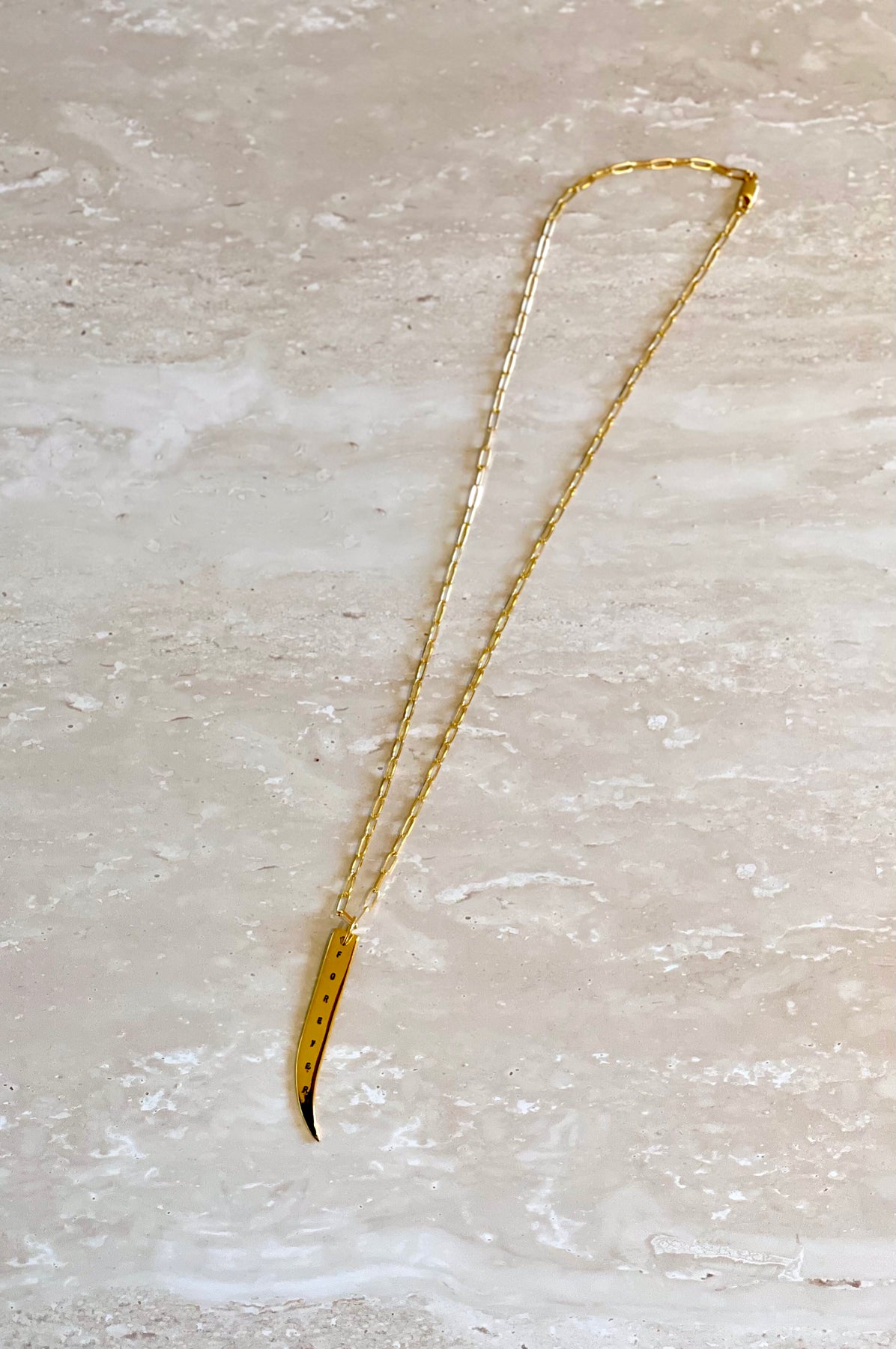 The Forever Tusk by Nikki Ross — a sleek gold pendant carved long and lean, engraved with the word FOREVER. A bold keepsake piece that hangs on a 50cm paper chain, striking in its simplicity but loaded with meaning. Perfect addition to any stack