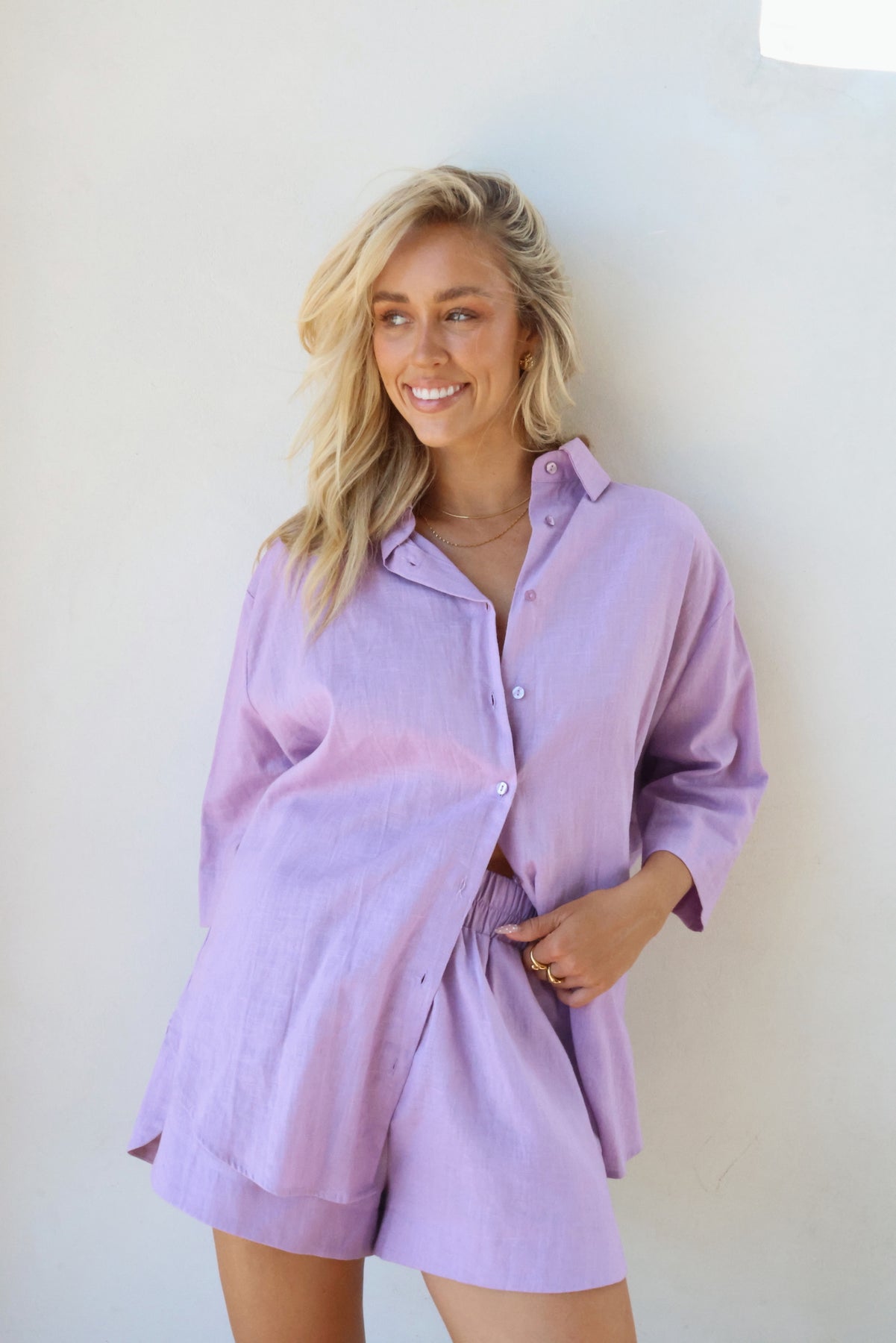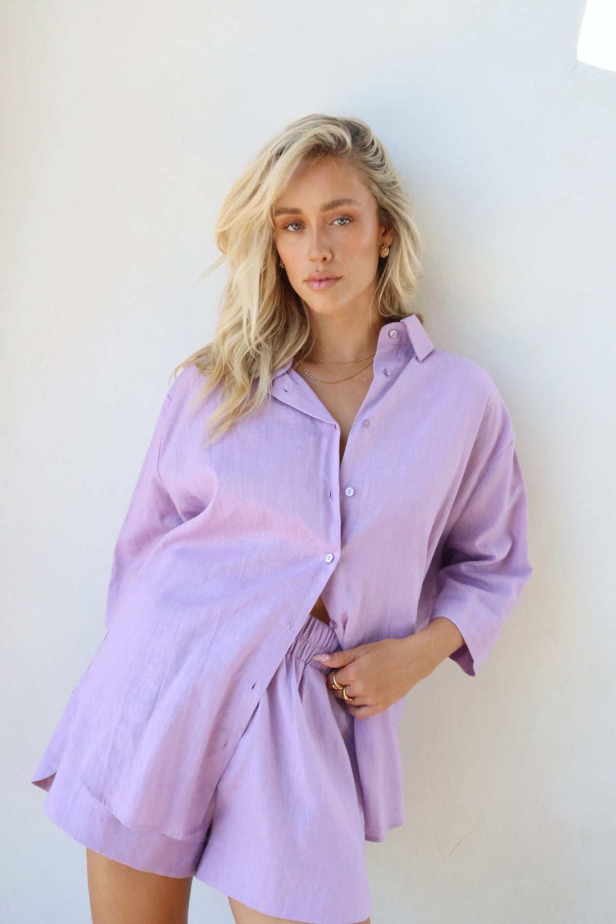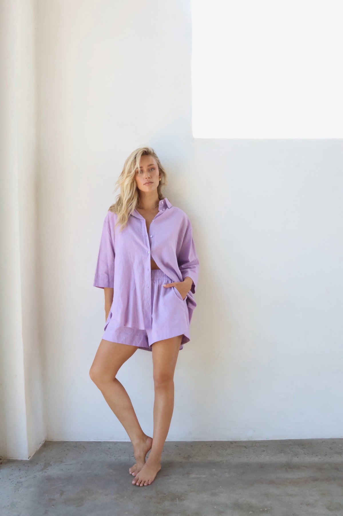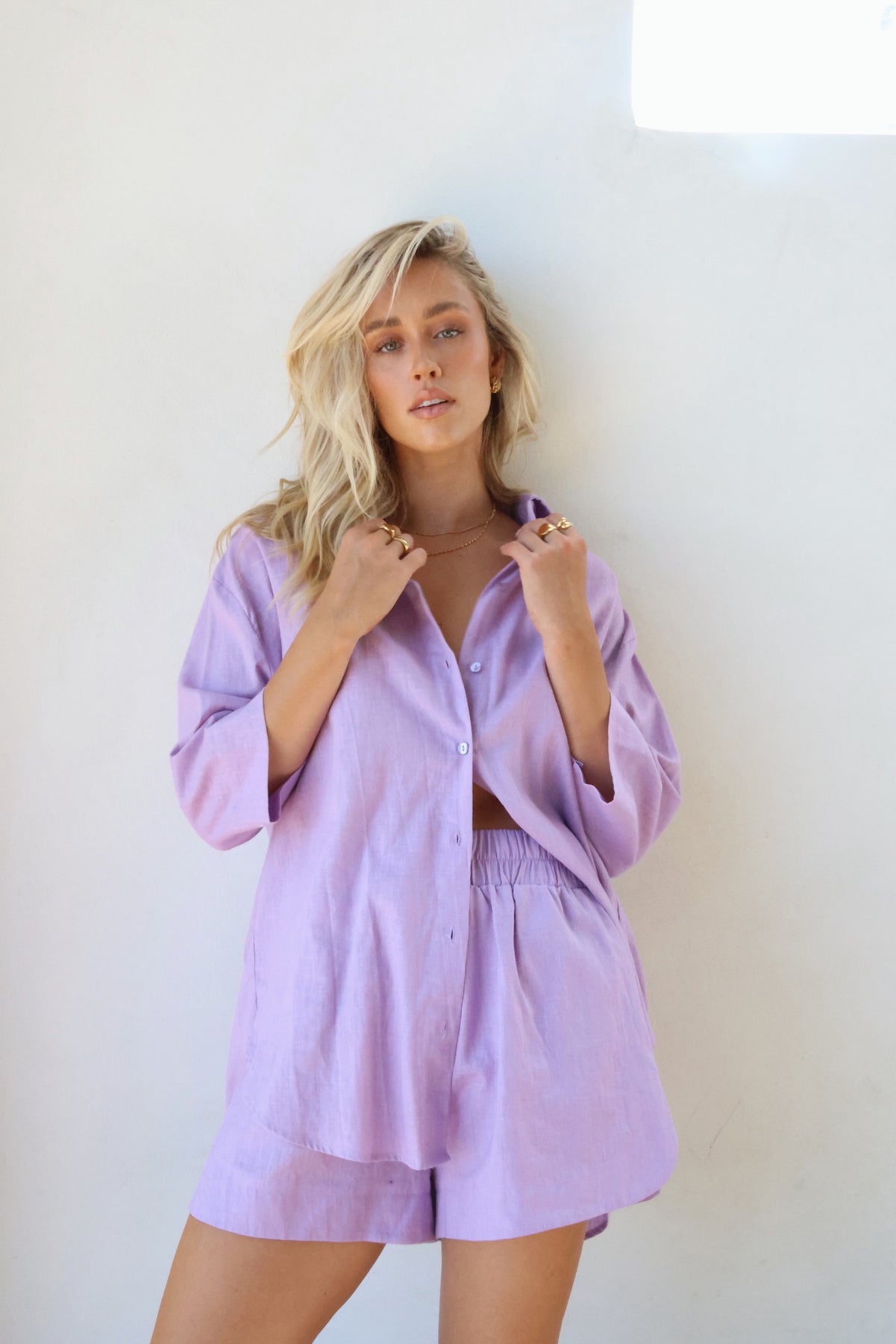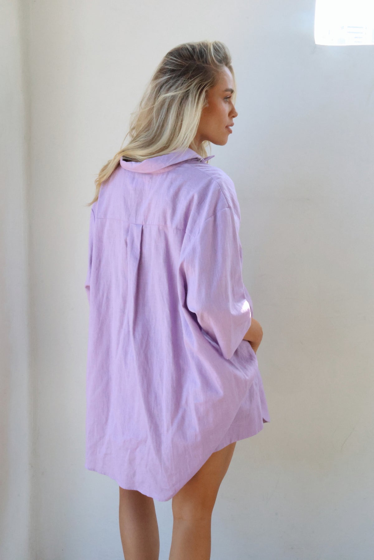 The must have shirt for the season, the Bowie short sleeve washed linen shirt. Crafted from 100% luxurious linen, this short sleeve shirt features an oversized button up fit, a curved hemline and side splits. The perfect throw on piece that can be styled with rolled sleeves or worn relaxed. Pair her back with the matching Knox shorts or Jones pants for the ultimate in set dressing.