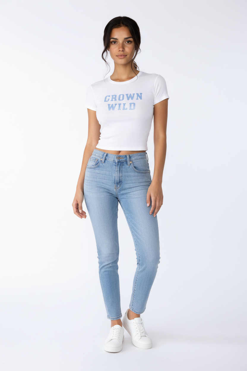 Discover rugged charm with Grown Wild Denim's graphic print, capturing the essence of Cowboy Country. This fabric offers a luxuriously soft and smooth feel, combining the breathability of cotton with the silky touch of modal in a flexible 2x1 baby rib knit, perfect for comfortable, snug-fitting garments.