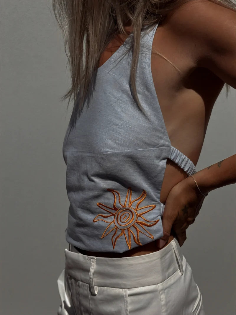 Crafted from a lightweight blend of 55% cotton and 45% linen, the Nacida Halter Top is perfect for warm days and breezy evenings. The top features a beautifully embroidered Sol motif in a bold vibrant orange, Paired with our powder blue linen, adds a refined touch making this piece as charming as it is versatile.