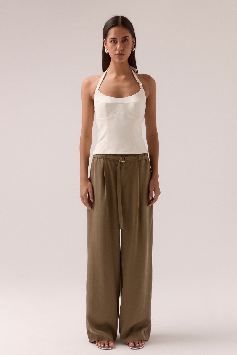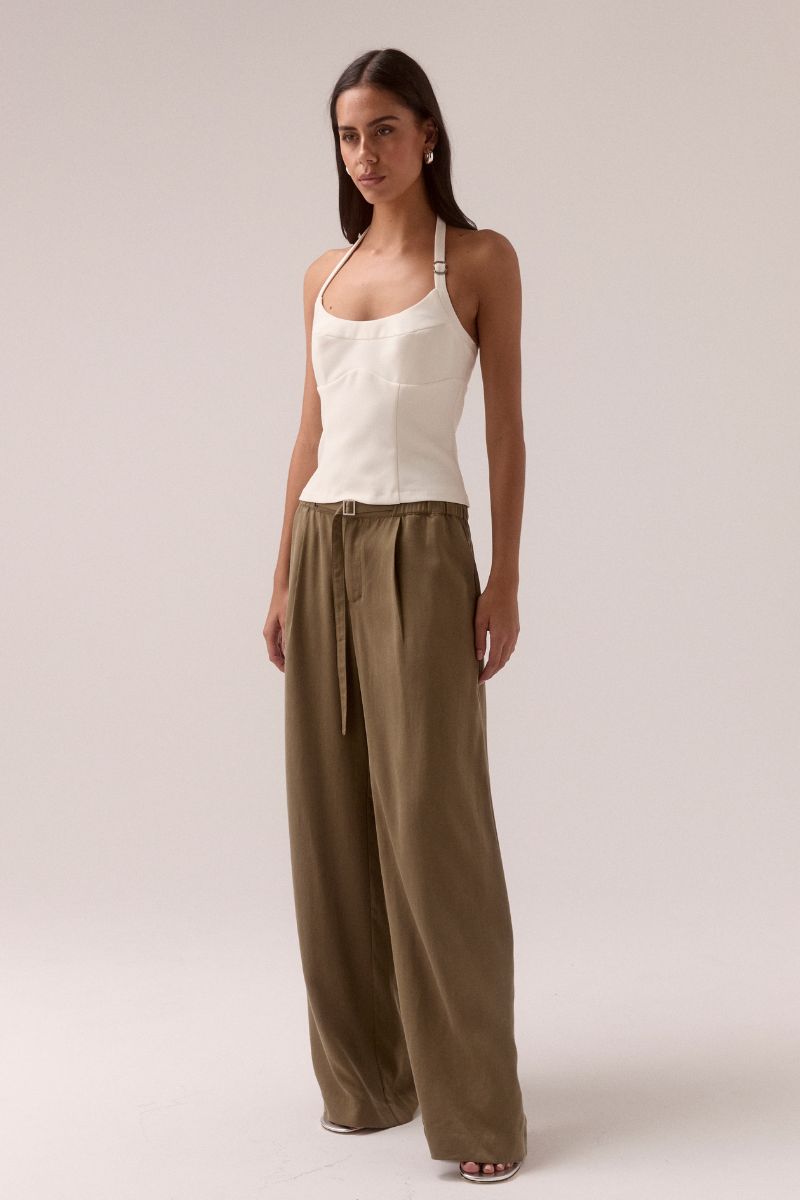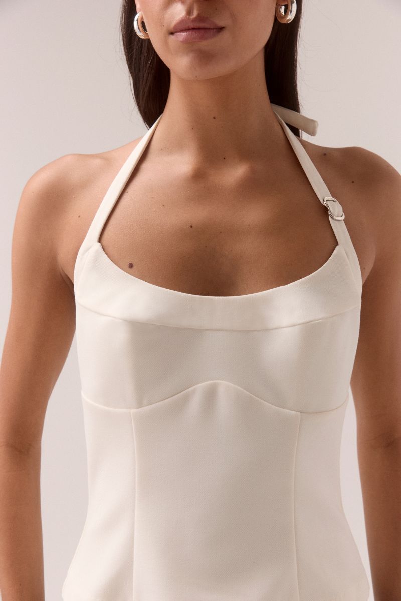 A clean silhouette with an understated edge.  The Demi top by Sovere Studio is crafted from a luxurious viscose blend.  Featuring a flattering halter design with a scooped neckline and a shaped underbust seam for elegant contouring. Silver metal sliders add refined detail to the front strap and back fastening, while an invisible back zipper ensures a seamless silhouette. Fully lined with body shaping panels, this top offers both sophistication and structure for a polished, confident look.
