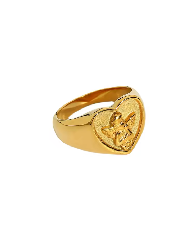 A finely embossed cherub rests at the centre of a smooth, heart-shaped ring bed — a subtle symbol of guidance, love, and softness carried into your everyday.