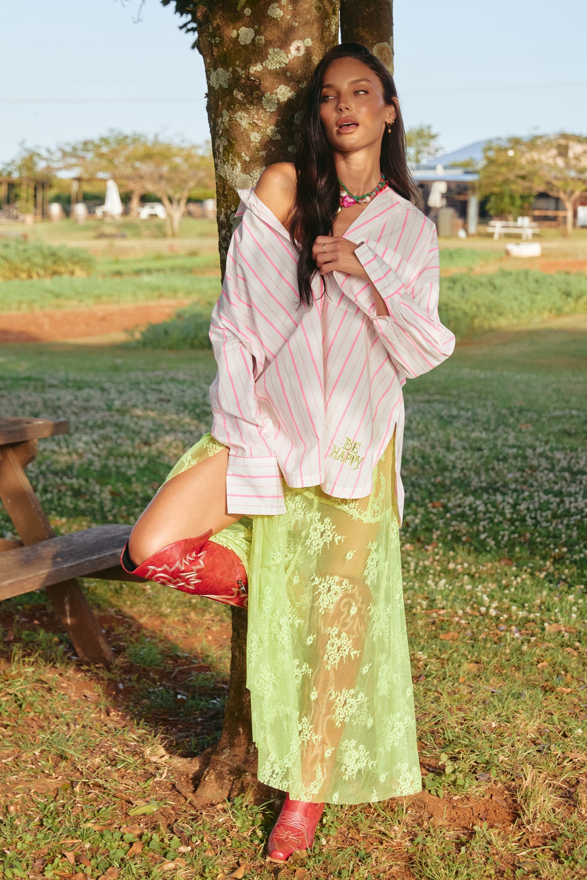 Bring a little drama to your day with The Lace Maxi Skirt. Crafted from sheer floral lace that floats as you move, this piece is part flirty, part fearless and 100% Sabbi.
