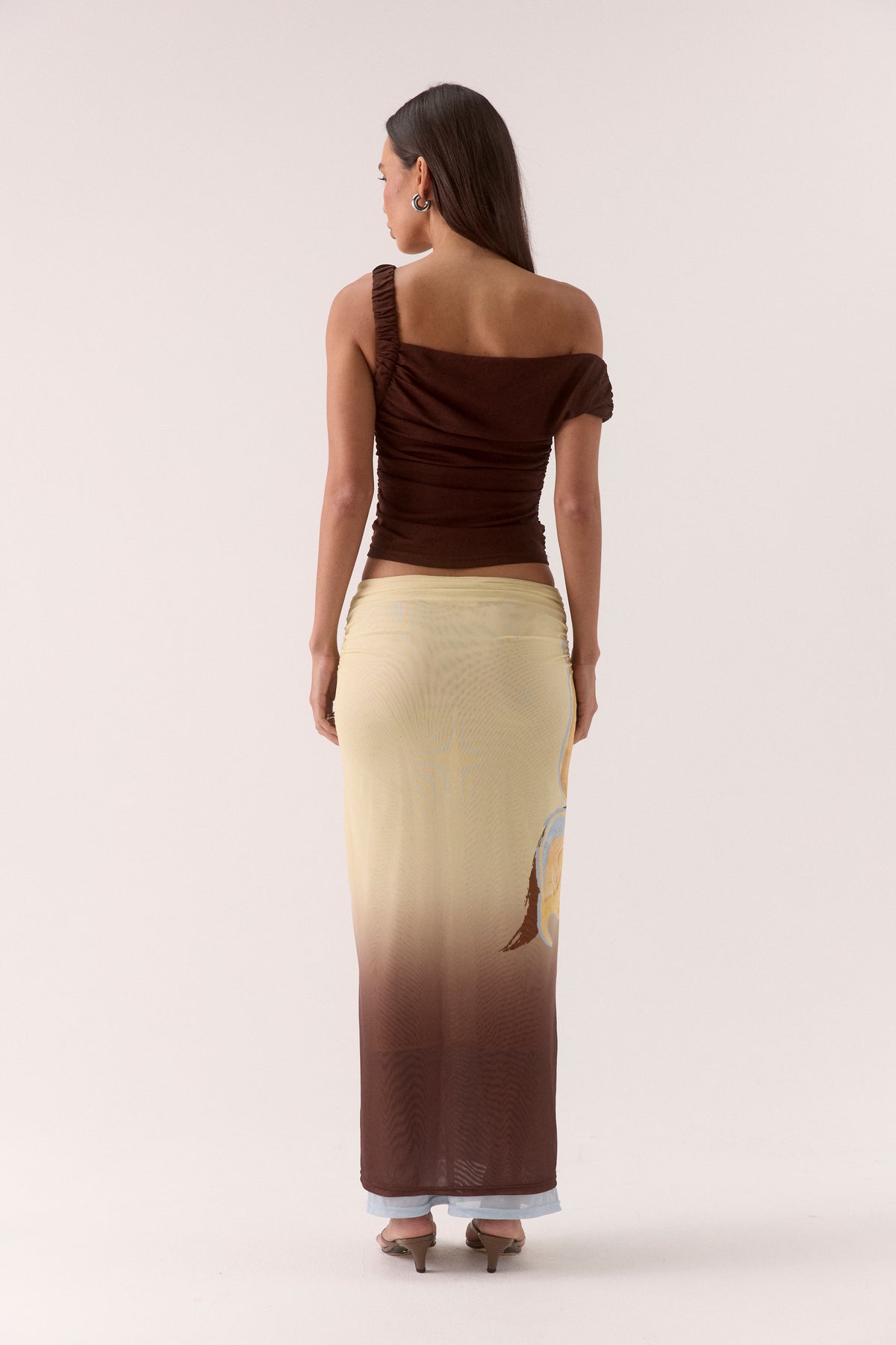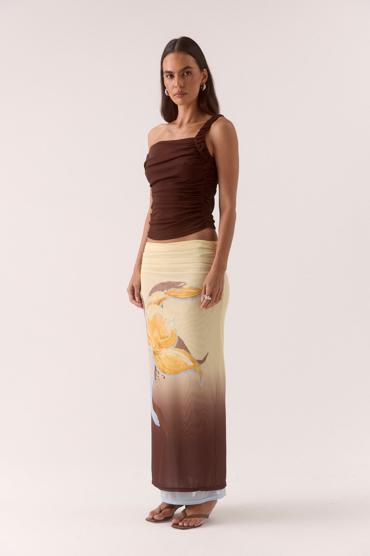- Gather detail strap that extends down the body